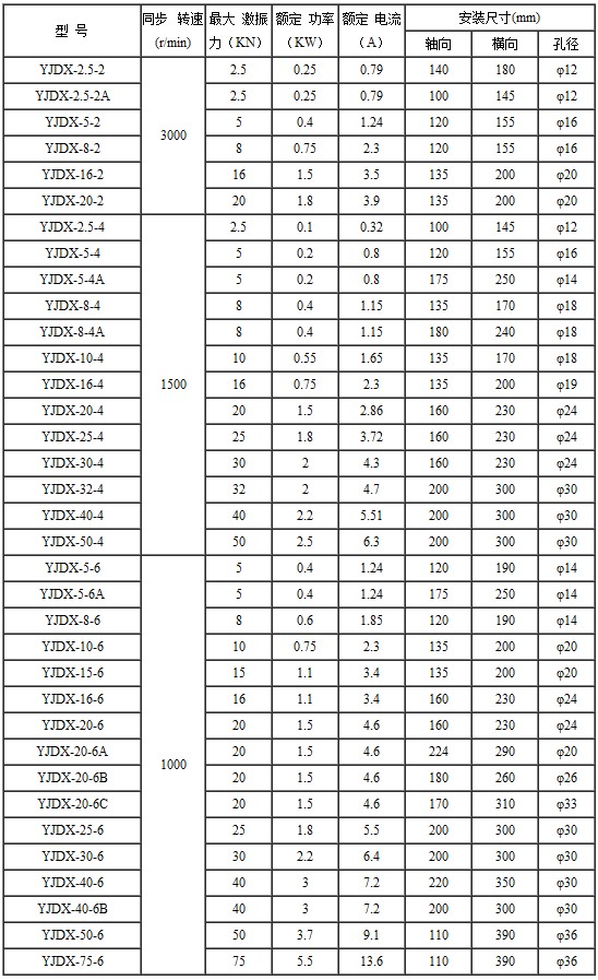 YJDX振動(dòng)電機(jī)相關(guān)技術(shù)參數(shù):